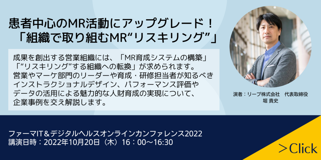 今回は、弊社代表取締役・堀が、患者中心のMR活動にアップグレード! 「組織で取り組むMR“リスキリング”」と題して講演を行う予定です。